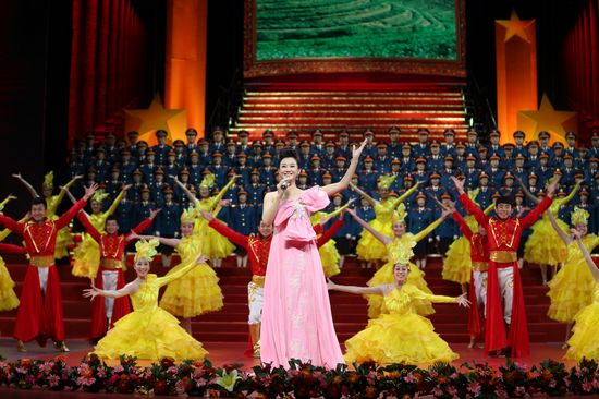 歌声不断,掌声不断。歌唱家郭兰英的一幕深情回忆和将军后代合唱团演绎的《我的祖国》片段,把观众带到了曾经的峥嵘岁月。50多年前,电影《上甘岭》插曲《我的祖国》风靡神州大地。如今,歌唱家再次登上舞台,讲述经典承载的那一份历史的记忆和情感。而在主办方设计的特别节目里,当年电影《洪湖赤卫队》中韩英的扮演者、歌唱家王玉珍也来到了现场。为了此次演出,她不仅专门定做了韩英的服装,还带来了祝福感言。她说:“每次走上舞台,我感觉就像鱼和水、莲和蓬那样相依相融,因为在这些激情燃烧的岁月里,我演唱的是音乐,跟着的是共产党。”