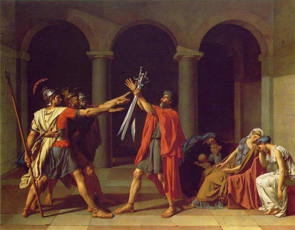 达维特是一位出色的历史画家,时势造英雄,处在那个年代的画家,以他满腔的热血创作了许多不朽的历史画名作。《荷拉斯兄弟之誓》是画家借古罗马的英雄故事表达了资产阶级革命的精神。这幅画是达维特第一次实际的凯旋,毫无疑问,也是革命的预兆之一。士兵宣誓场面的平淡无奇,父亲姿态的装腔作势,女人们矫揉造作的疲惫模样,都妨碍了人们看出这一作品的艺术上的长处。可是与此同时,谁都不能忘记,在这幅作品中,造型语言第一次倾吐得如此质朴,充满了罗马式的庄严,并且才气洋溢地突出着战士的强有力和妇女的孱弱之间的对比。这幅画所具备的图解性,很容易地说明了它之所以获得成功。至于这幅画的形体和色彩,则可以说它们是一样粗糙、抽象、没有感情、没有个性的,但有一个差别,那便是这幅画的不伦不类的形体显示了达维特对古典形体的精通,而不伦不类的色彩却只是达维特完全忽视色彩关系的结果。从我们上面提到的两幅作品来看,达维特在1784年就已经在技艺方面达到充分成熟。他的风格的演变一直延续到他去世时为止,可是其基础却始终未变。