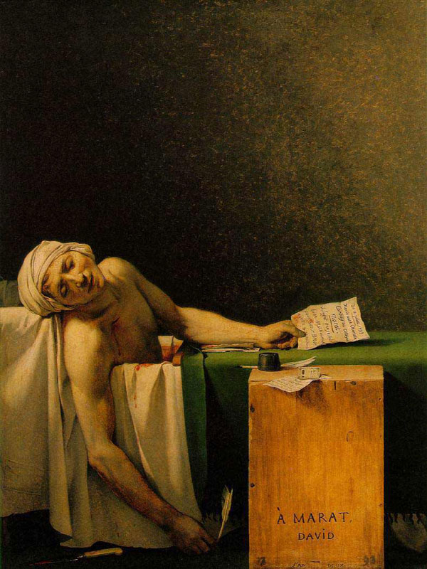 另外一幅革命题材的画作,《马拉之死》是一幅不朽的肖像画名作。马拉是一位物理学家、医药博士,法国大革命是成为职业革命家,他是雅各宾党的领导人之一,他在1793年7月13日在家中浴盆中被与反对雅各宾党的吉伦特党有勾结的女保皇分子夏洛特.科尔黛刺杀身亡马拉的死激起了法国人民的极大愤怒和抗议,也深深震惊了达维特,他真实的刻画了马拉之死的真相,画风极为写实,局部刻画也很详实。这是一副沉浸于深刻的悲剧情感中的、结构简洁而严谨的作品,达维特成功的把人物肖像描绘、历史的精确性和革命人物的悲剧性结合起来。