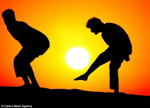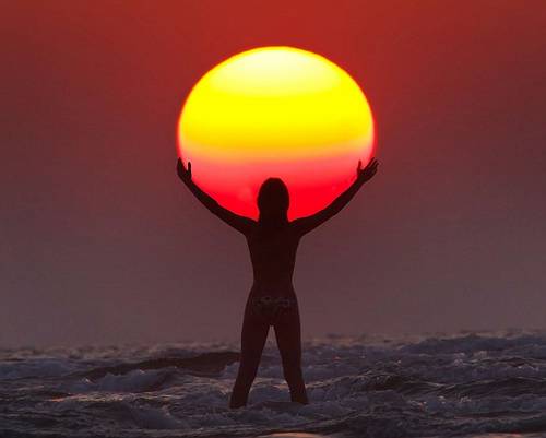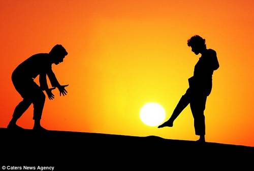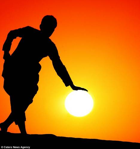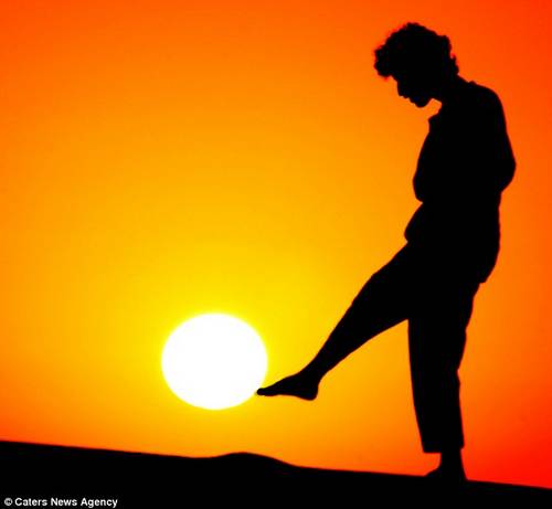 23岁的摄影师Malek别出心裁的利用错位拍摄法拍摄出了一组有趣的人与太阳的合影。合影中有女人“托举”起太阳的照片也有两个男人把太阳当球踢的照片。