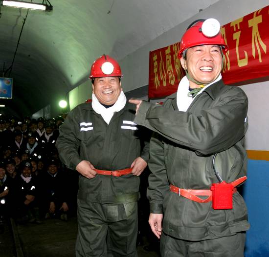 2009年3月,著名曲艺表演艺术家姜昆、戴志诚到新集煤矿井下为工人们演出 。摄影:张生福