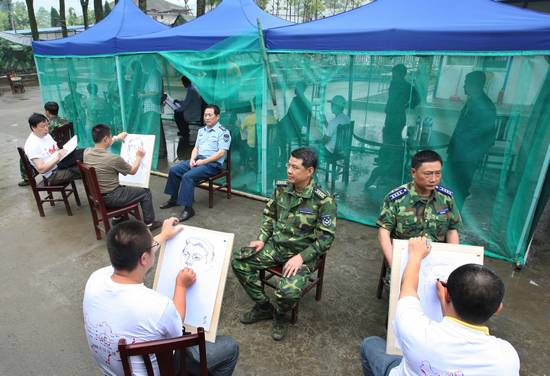 2008年6月,来自北京等地的国内著名画家在四川地震灾区,为抗震救灾的部队官兵写生作画。摄影:张风