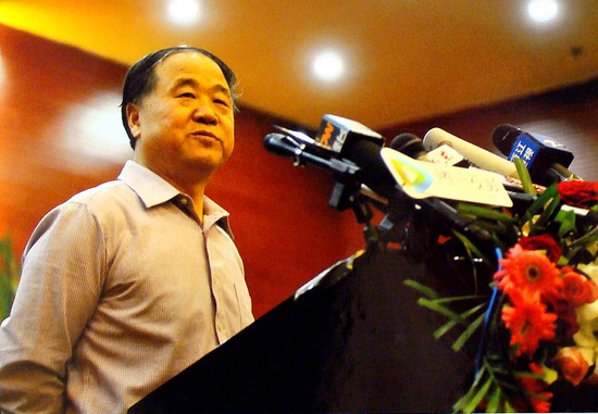 “科学发展 成就辉煌”图片展·“文化建设”部分·2012年10月1日,莫言获得2012年诺贝尔文学奖。图为莫言在接受记者采访。