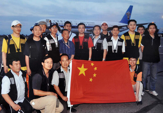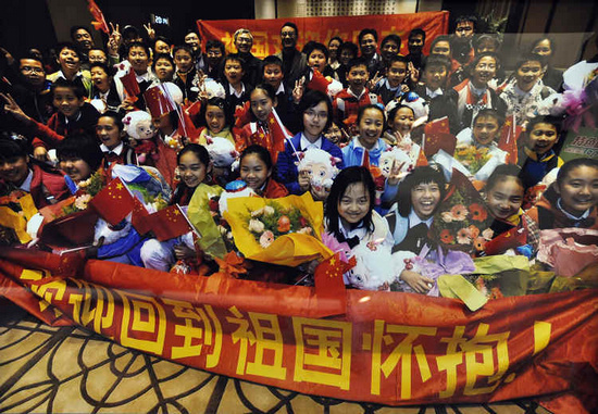 “科学发展 成就辉煌”图片展·外交部分·2011年2月1日,滞留埃及开罗机场的广州东川路小学管乐团46名师生安全返回广州。