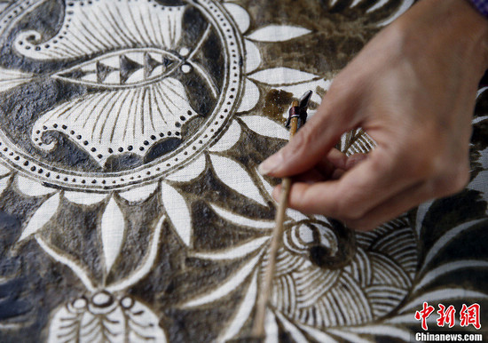 蜡染的制作工艺在中国已有2000多年的历史。在贵州境内的山区,蜡染有着其特殊的传承方式:一般以女性传承为主,苗族姑娘几岁时开始和母亲学习蜡染,十五六岁时就已练就一手娴熟的技艺。图为一名艺人正在绘制蜡画,她不用任何工具,构图全凭个人想象,且作图没有统一固定的版本,所以制作出来的蜡染作品没有一件是相同的。