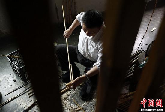 贵州是中国苗族聚居人口最多的省份。在世人熟知的苗族吊脚楼里,一批珍贵的非物质文化遗产得以传承。2006年,贵州雷山苗族银饰锻制技艺、雷山苗族芦笙制作技艺和丹寨苗族蜡染制作技艺,共同被列入第一批中国国家级非物质文化遗产名录。在这背后,则是一群默默坚守传统的苗族非遗传承人。芦笙,为西南地区苗、瑶、侗等民族的簧管乐器。雷山,有“芦笙之乡”、“歌舞之乡”美称。61岁的莫厌学,是贵州雷山县排卡芦笙村人,家中四代以制作芦笙为生。莫厌学自懂事起就开始做父辈的帮手,至今已快50年。莫家在一个吊脚楼里,莫老太与儿媳妇加工竹管,小儿子做笙斗,大儿子跑外销,莫厌学负责关键技术——簧片、定音、调试。图为莫厌学在自家阁楼内制作芦笙。