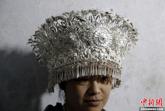 一名苗族女孩展示杨光宾制作的纯银头饰。苗族银饰品种多样,分为头饰、面饰、颈饰、肩饰、胸饰、腰饰、臂饰、脚饰、手饰等。