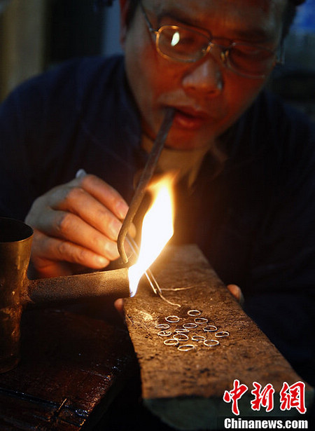 图为杨光宾手工编造银环,他辅以焊结工艺,最终将不同的组件固定在一起成型。