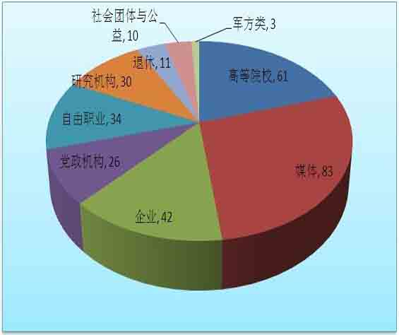 “意见领袖”人群在媒体、高校工作的人数最多,然后是企业组织、自由职业者、研究机构、退休人员、社会团体与公益事务、党政军系统等等。值得一提的是,他们中近半数有过体制内职业经历或仍在体制内工作。