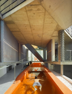 而整个 Pool house 的核心“pool”就位于这三个容器的中央位置,一道长长的橙色泳道在建筑物整体灰色与棕色的映照下显得亮眼醒目,虽然与别墅中的游泳池或者公共游泳池相比单独的一条泳道有些势单力薄,但是对于普通家庭的娱乐和锻炼来说已经足够,平时有亲友来访时一同下水共乐一番也是绰绰有余。