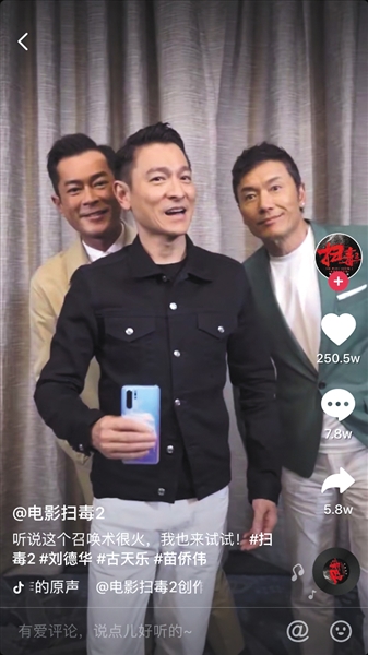 营销团队在抖音上发的视频也是主打三人之间的互动,只要是三人同框的视频,再加上一些简单的创意,传播效果都不差。其中使用短视频特殊剪辑效果制作的“手机召唤术”将三人同框的视频点赞数有250万,古天乐翻纸悬赏,刘德华在一旁说“够了够了”的视频,达到最高的296万点赞数。