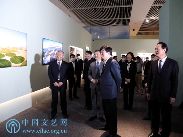 4月9日,“希望的田野——脱贫攻坚 共享小康全国摄影展”开幕式在京举行。图为与会领导嘉宾参观展览。