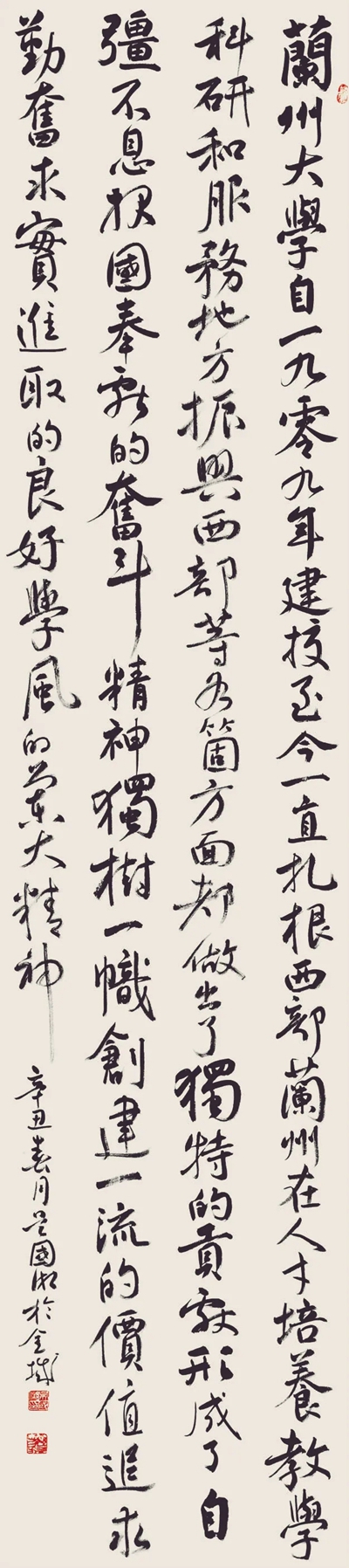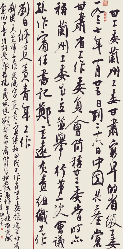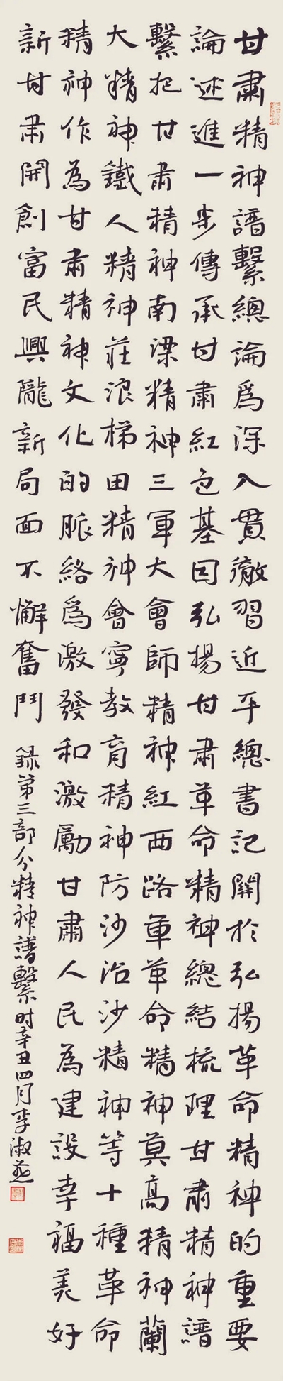 在庆祝中国共产党成立100周年之际,在“两个一百年”奋斗目标历史交汇的关键时刻,由中国书法家协会、甘肃省委宣传部、甘肃省委党史研究室、甘肃省文化和旅游厅、甘肃省文学艺术界联合会主办,甘肃省书法家协会承办的“庆祝中国共产党成立100周年系列书法展(甘肃篇)——百年华章·红色陇原书法作品展”在甘肃艺术馆展出。