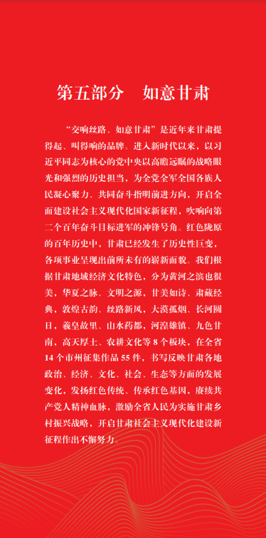 为此,甘肃省书法家协会组织广大书法工作者积极参与,最终确定215名书法家进行命题创作。创作内容以中国共产党波澜壮阔的百年征程为主线,分重要文献、领袖语录、精神谱系、红色陇原、如意甘肃五个单元来展现中国共产党百年初心的历久弥坚,传承中国共产党百年奋斗的红色基因,凝聚中国共产党接续前行的奋斗伟力,表现陇原大地上从新民主主义革命时期、社会主义革命和建设时期、改革开放时期、中国特色社会主义进入新时代的壮丽篇章。