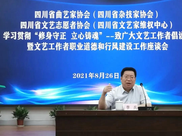 四川省曲艺家协会、四川省杂技家协会、四川省文艺志愿者协会、四川省文艺家维权中心联合召开学习贯彻《修身守正 立心铸魂—致广大文艺工作者倡议书》暨职业道德和行风建设工作座谈会,会上表示,行风建设工作是重要的战略问题,更是永恒的课题。作为新时代的文艺工作者,不仅要在文艺创作上追求卓越,更要在精神境界上追求卓越。秉持初心、见心明德,不负立心铸魂的使命担当。