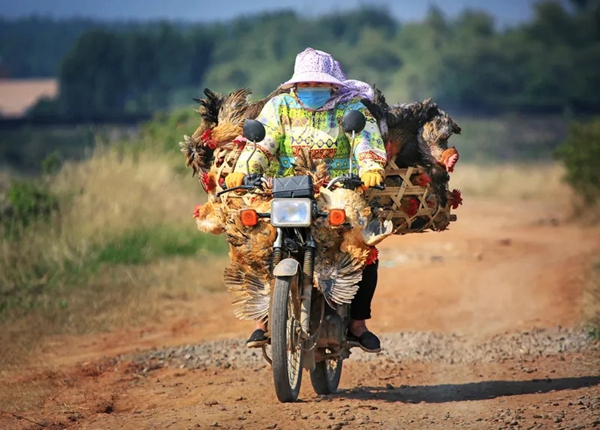 2020年3月11日,广东省麻章区太平镇,一名养鸡场场主冒着早春的冷风,骑摩托车赶着将肉鸡运往市场。