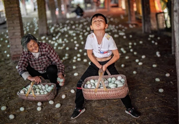 2019年5月5日,湖北省监利市,朱河镇周胡小学学前班的学生胡灿调皮地提起满满一篮鸭蛋,测试自己的力气有多大。在扶贫工作队的帮助下,他们家养了1200只鸭子,日产蛋约1100枚,实现脱贫。