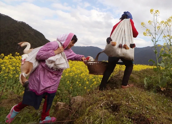 2019年3月23日,浙江省衢州市龙游县庙下乡,村民背着家禽进城赶集。