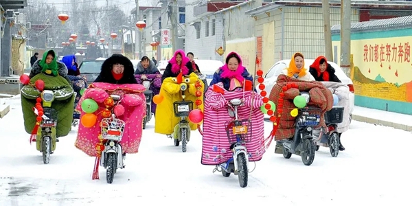 2019年2月10日,河南省新乡市潞王坟乡西同古村, 村民正在去往排练春节演出节目的路上。