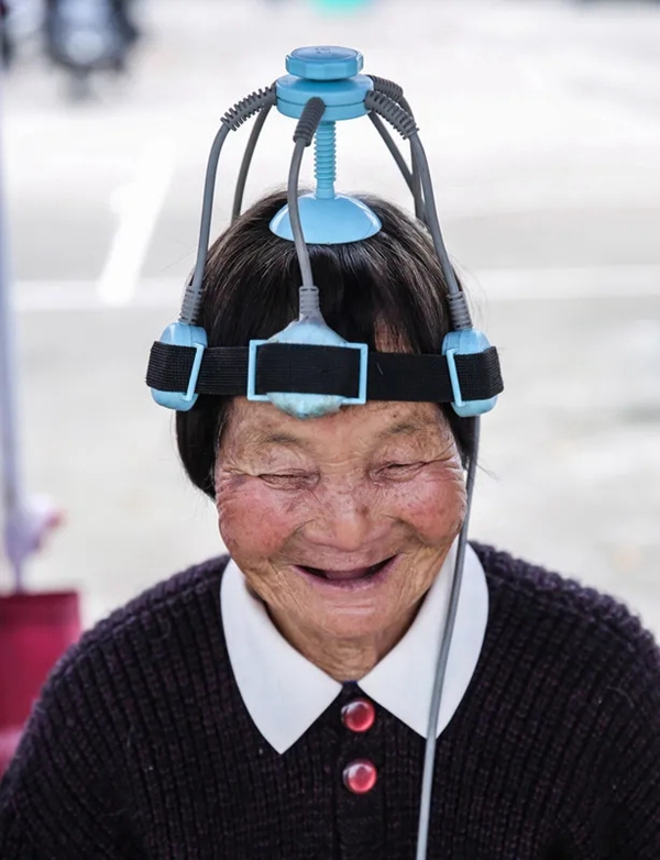 2021年2月28日,浙江省永康市唐先社区卫生室,一位农村大妈在体验头部磁疗仪。