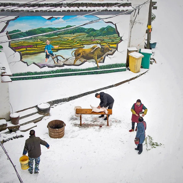 2018年1月29日,浙江省武义县大莱村,从事土羊养殖业的王松昌(左二)正在雪地里宰羊,迎接新春佳节。