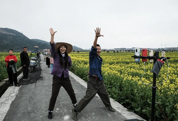 2021年2月25日,浙江省瑞安市桐浦乡,一对夫妻在田间进行网上直播。