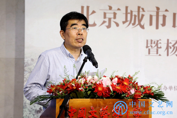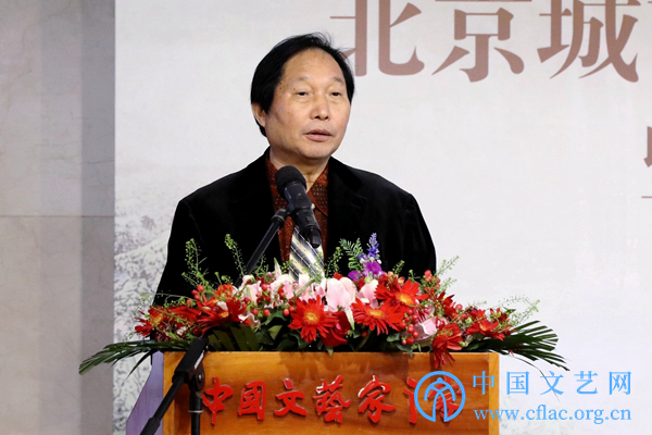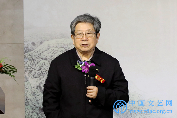 10月12日,北京城市山水画研究会名家作品邀请展暨杨留义城市山水画师生作品展在京举办。图为原文化部副部长潘震宙在开幕式上致辞。 中国文艺网 高森 摄
