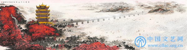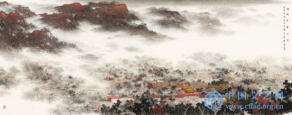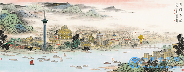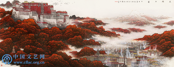 杨留义师生创作的城市山水画,其共性是都有山有水有城,而且无一不是首先突出山水,使之保持山水画的品质,然后再巧妙布局城市物象——如杨留义创作的《广州吉祥》用大片的红渲染木棉花,使树的山水地位得到强化,著名的“小蛮腰”和“五羊雕塑”,则在远眺之中风姿绰约;《天骄西藏》则用绛红将布达拉宫的红宫和夕照下的群山互相呼应,群山之红彰显了世界屋脊阳光之城的灿烂景观,这些作品都很好地解决了城与山和水的关系。
