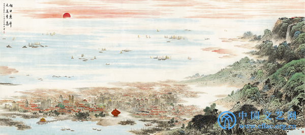 杨留义描绘的每一个城市,都会充分顾及它的历史、地理、环境、地标性建筑——《最忆杭州》将雷峰塔、西湖、三潭印月置于画面中心位置,远处才有隐约可见的城市楼群,其中又突出了G20峰会主建筑,可以说是融古今为一炉,而更多的篇幅还是给了青绿山水,甚至一处完全来自传统山水画的叠瀑;《旭日东升 大美青岛》抓住青岛大海日出的城市特点,以崂山为山,以大海和点点渔帆为水,天际高悬一轮红日,一片海滨城市建筑中,又突出五四广场的红色雕塑,以及栈桥、八大关等青岛地标,城市山水因此达到了赏心悦目的效果。