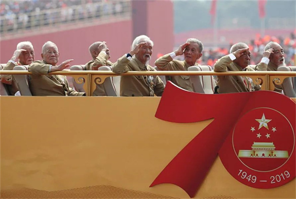 2019年10月1日,北京,庆祝中华人民共和国成立70周年大会现场,致敬方阵组成的21辆礼宾车徐徐驶过天安门广场。车上是老一辈党和国家、军队领导人亲属代表,老一辈建设者和亲属代表,新中国成立前参加革命工作的老战士,老一辈军队退役英模、民兵英模和支前模范代表。
