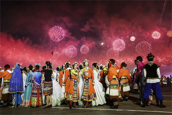 2019年10月1日晚,北京,庆祝中华人民共和国成立70周年联欢活动上,演员们观看烟火表演。