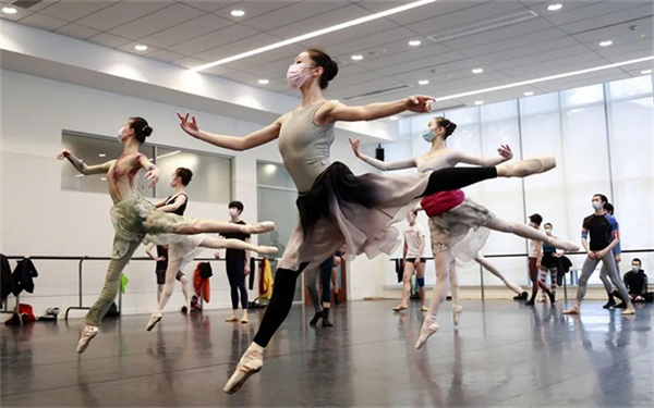 2020 年3月2日,上海芭蕾舞团的舞者在排练厅戴着口罩起舞。