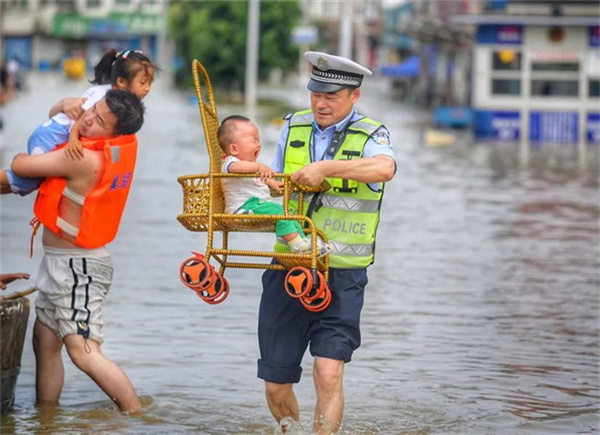 2020年7月20日,安徽巢湖市公安局交警大队夏阁中队民警童宜平(右一)转移因水灾受困的群众。