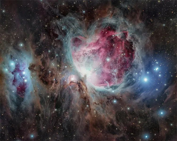 猎户座星云有 3 颗排列整齐的亮星,另外还有斜着排列的 3 颗小星,不用望远镜观测,肉眼就能看出 3 颗小星中间那 颗隐隐约约地泛着红光。它并不是一颗恒星,而是猎户座大星云,是猎户座中的一个发光气体云,在猎户座佩剑中部, 能直接观测到。该星云与一个恒星形成区相连,被它所含的年轻恒星照亮,在天文照片上显得十分壮观。猎户座大星 云也是辨认猎户座的指标之一。