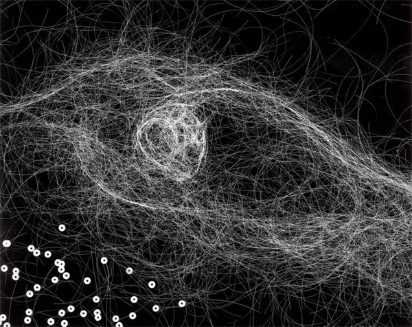 使用头发、衣物配饰、零件等综合材料,采用8×10 依尔福黑白相纸,在暗房内进行物影照片制作。意在用微观的物体隐喻宇宙的宏大。