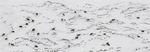 2019年5月17日,新疆和静县巴音布鲁克草原,野生北山羊迁徙。