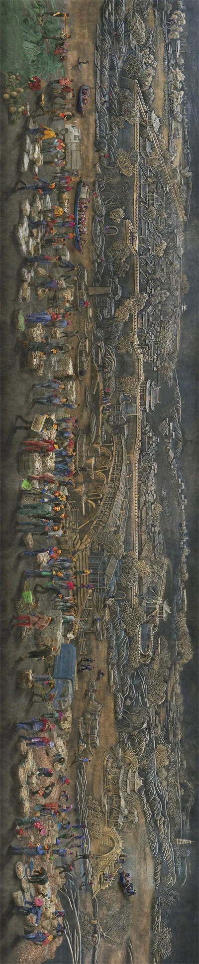 这幅创意作品,前期拍摄了大量人物、码头交易、渔船进港等素材,历时3年多;背景素材拍摄于杭州钱塘古城铜雕,通过接片完成;后期创意及制作处理耗时三个多月。作品旨在体现盛世之下,渔民热火朝天的工作场景及对鱼获丰收的喜悦。