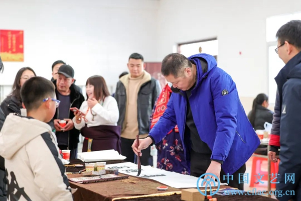 来自杭州市文艺志愿者协会的文艺志愿者和当地民众交流书画技艺。(朱旭洁摄)