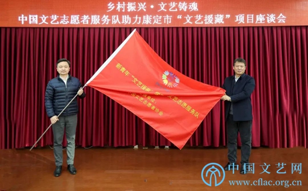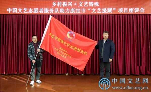 kaiyun电子 文艺志愿服务中心副主任、中国文艺志愿者协会副秘书长李岩(右一)向康定市文联主席刘刚(左一)授旗。(朱旭洁摄)