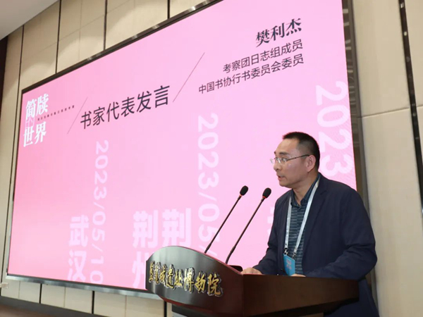 樊利杰代表参与书家发言。他分享了全程考察心得,表示走近鲜活的文物,观摩两千年前的简牍文字,得到艺术和文化知识的双重感受,是对读万卷书行万里路的现实解读。书法工作者要开阔视野、扩宽思路,加大新出土新发现材料在书法取法的权重,关注传统经典的时代表达,使之焕发新生机。