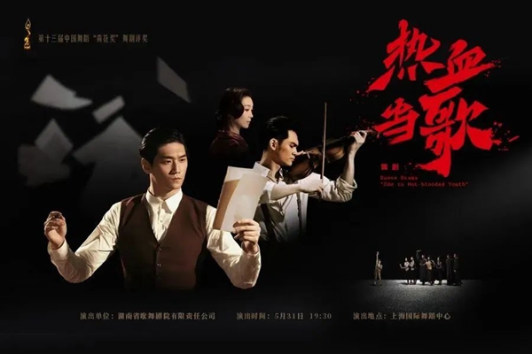 舞剧《热血当歌》讲述了热血青年田汉、聂耳、安娥的故事。20世纪30年代,上海滩纸醉金迷,民众苦难挣扎,国家内忧外患。九一八事变、一二八事变、抗日战争全面爆发,在遭受种种挫折和深深震撼之后,田汉、聂耳、安娥毅然加入中国共产党。他们用文艺为劳苦大众和抗日救亡发声,最终创作出《义勇军进行曲》,唤起不愿做奴隶的人们,为国家和民族的独立自由、解放奋起抗争。该剧入选为国家艺术基金2023 年度传播交流推广资助项目,荣获第七届湖南艺术节“田汉大奖”、湖南省第十五届精神文明建设“五个一工程”优秀作品奖、湖南省第二届“文学艺术奖”优秀作品奖等。