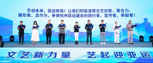 2023年7月20日,杭州亚运会会徽、奖牌、吉祥物等亚运元素设计者和“文艺两新”代表宣读“文艺新力量·艺起迎亚运”倡议书。
