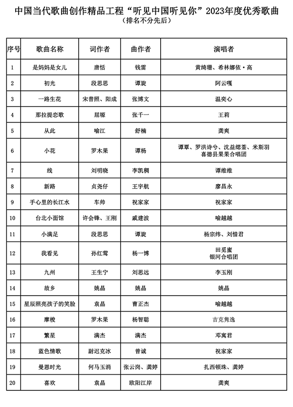 中国当代歌曲创作精品工程“听见中国听见你” 2023年度评选结果公示