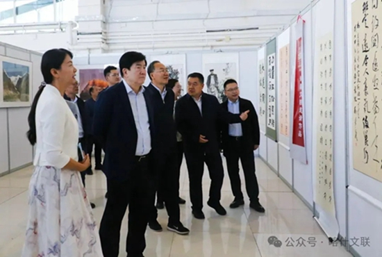 李屹一行参观喀什地区“丝路华章——庆祝中华人民共和国成立75周年”美术书法摄影民艺联展。方礼 摄