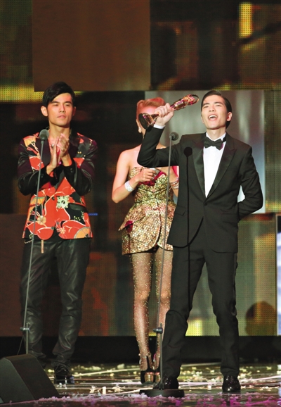“雨神”萧敬腾从蔡依林和周杰伦手中接过最佳国语男歌手的奖杯,最近事业顺风顺水的萧敬腾在台上大喊“超爽”。