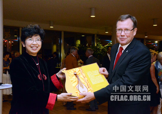 在招待酒会上,赵实向皮亚·哈特金和肯特·安德森分别赠送了一幅真丝刺绣长卷《颐和园》以及一把工艺琵琶。