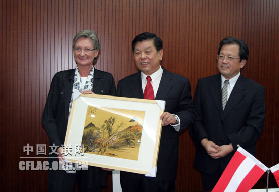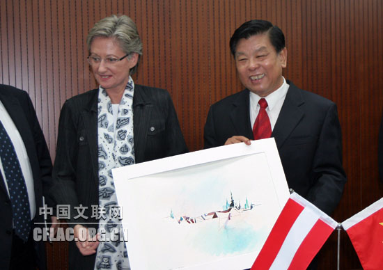 向奥方赠送了冯远国画作品《野渡无人舟四横》等礼物;奥方回赠了奥地利著名水彩画家古特罗夫的新作。
