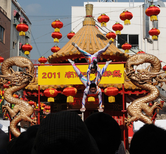 为期4天的日本神户唐人街——南京街庆祝春节庆典活动3日拉开帷幕,首日的舞狮、舞蹈、杂技表演等多彩活动受到众多游人赞赏。