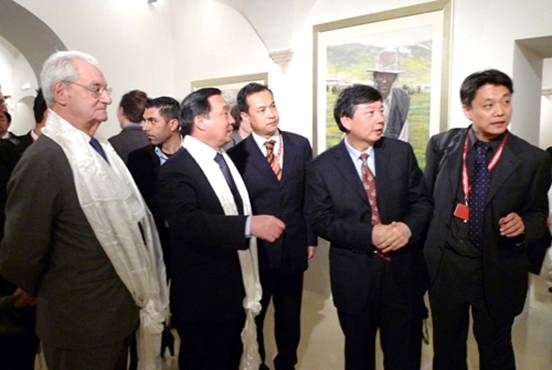 2009年12月2日在意大利威尼斯宫主办的“雪域高原”中国美术作品展上,中国美协常务副主席吴长江向意大利文化友人介绍展览作品