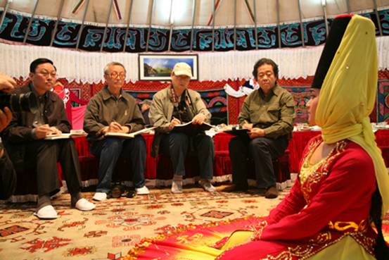 中国美协配合中央新疆工作会议精神,组织著名美术家赴新疆写生创作,举办新疆专题展,图为中国美协分党组副书记刘健秘书长率采风团在新疆天池湖畔帐篷里写生